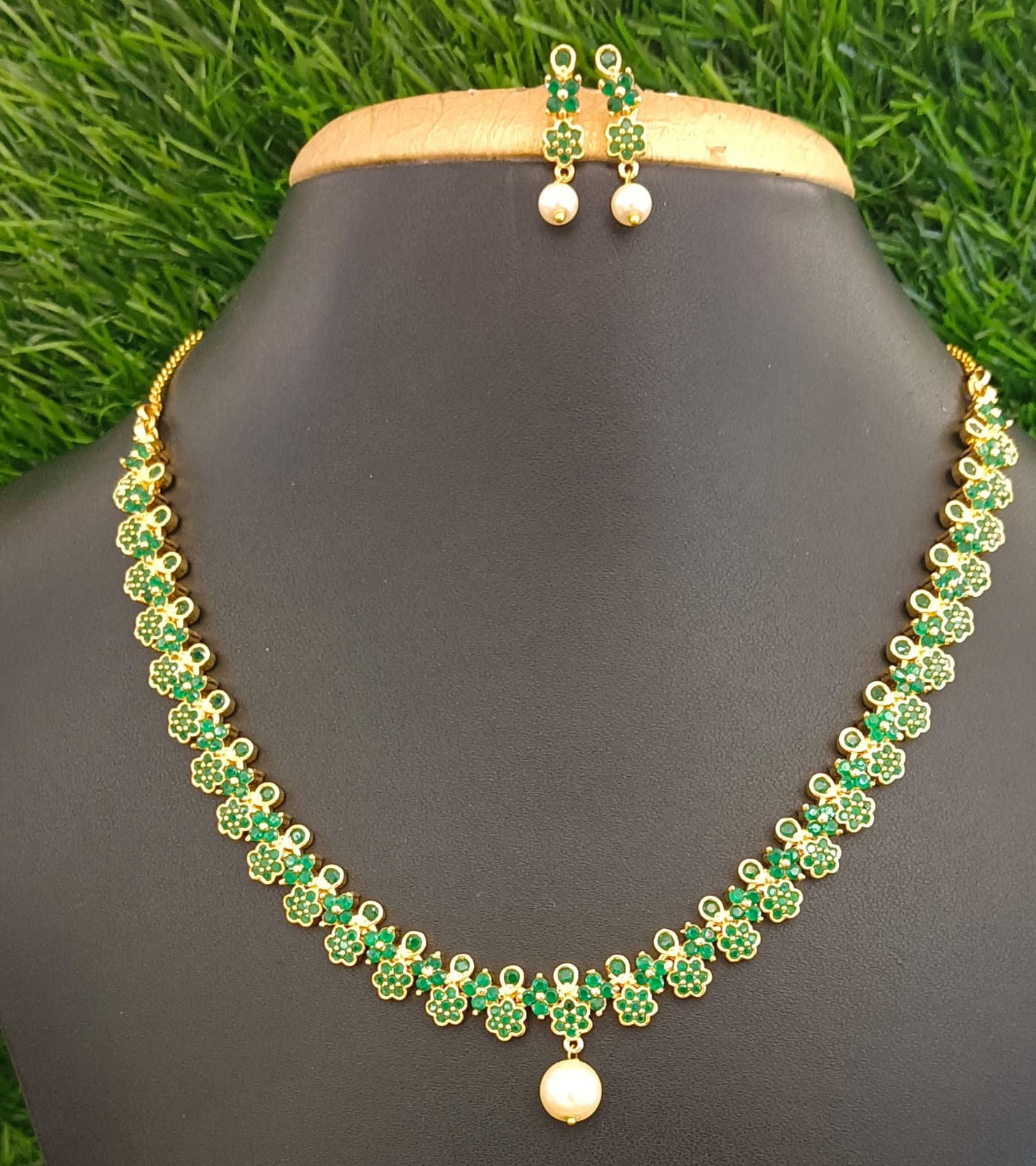 This exquisite green floral gold-plated choker necklace is a blend of elegance and tradition. Adorned with tiny floral motifs in rich green enamel, the design exudes charm and sophistication. A delicate pearl drop at the center enhances its regal appeal, making it perfect for weddings, festive occasions, or cultural celebrations. The necklace comes with matching floral earrings featuring a pearl drop for a complete, graceful look. Lightweight yet luxurious, this piece is crafted to provide comfort without compromising on style.